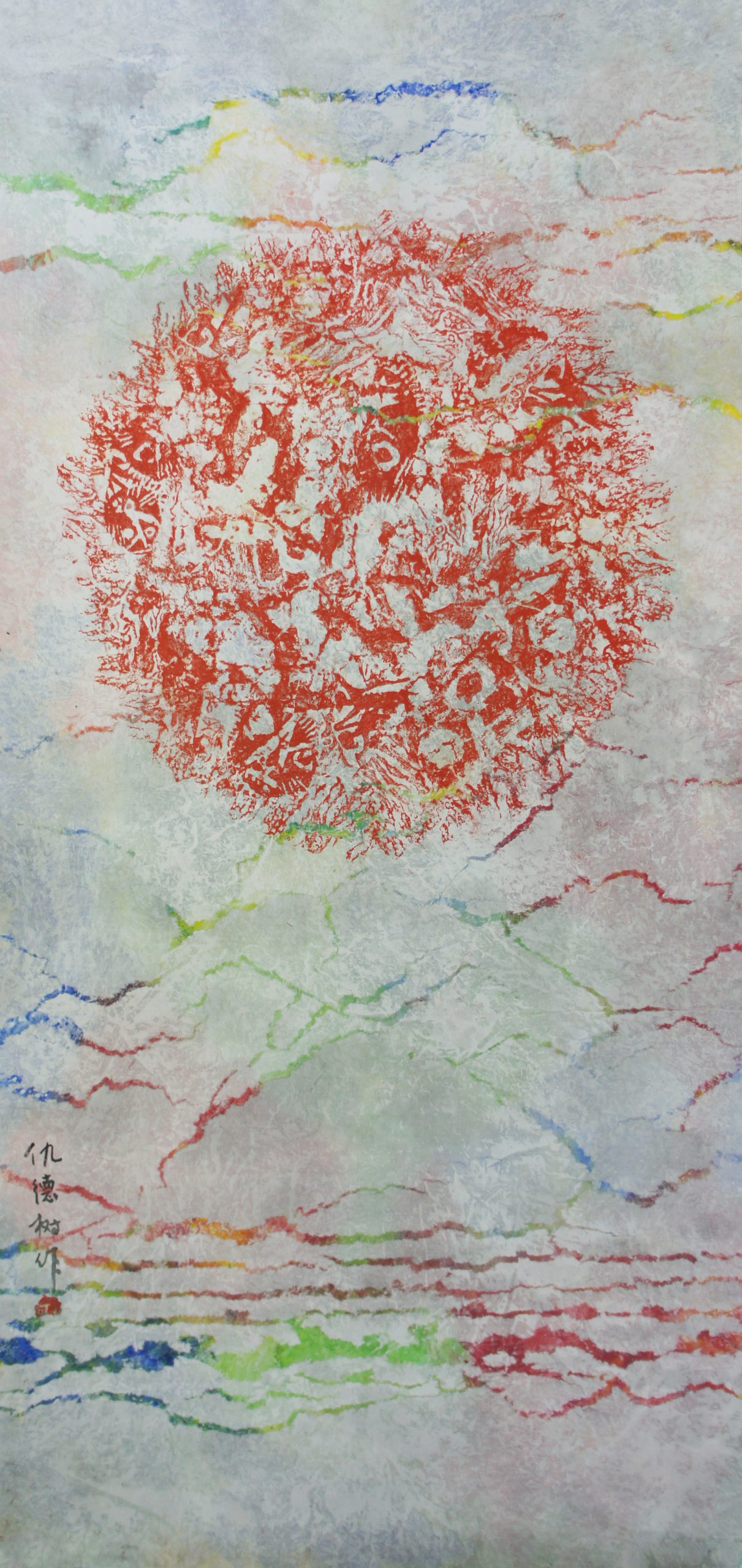 Qiu Deshu b.1948 Fissuring –Sublimation(Seal Carving),1982 Xuan paper, acrylic, red seal ink paste 134 x 64 cm; 52 4/5 x 25 1/5 in.