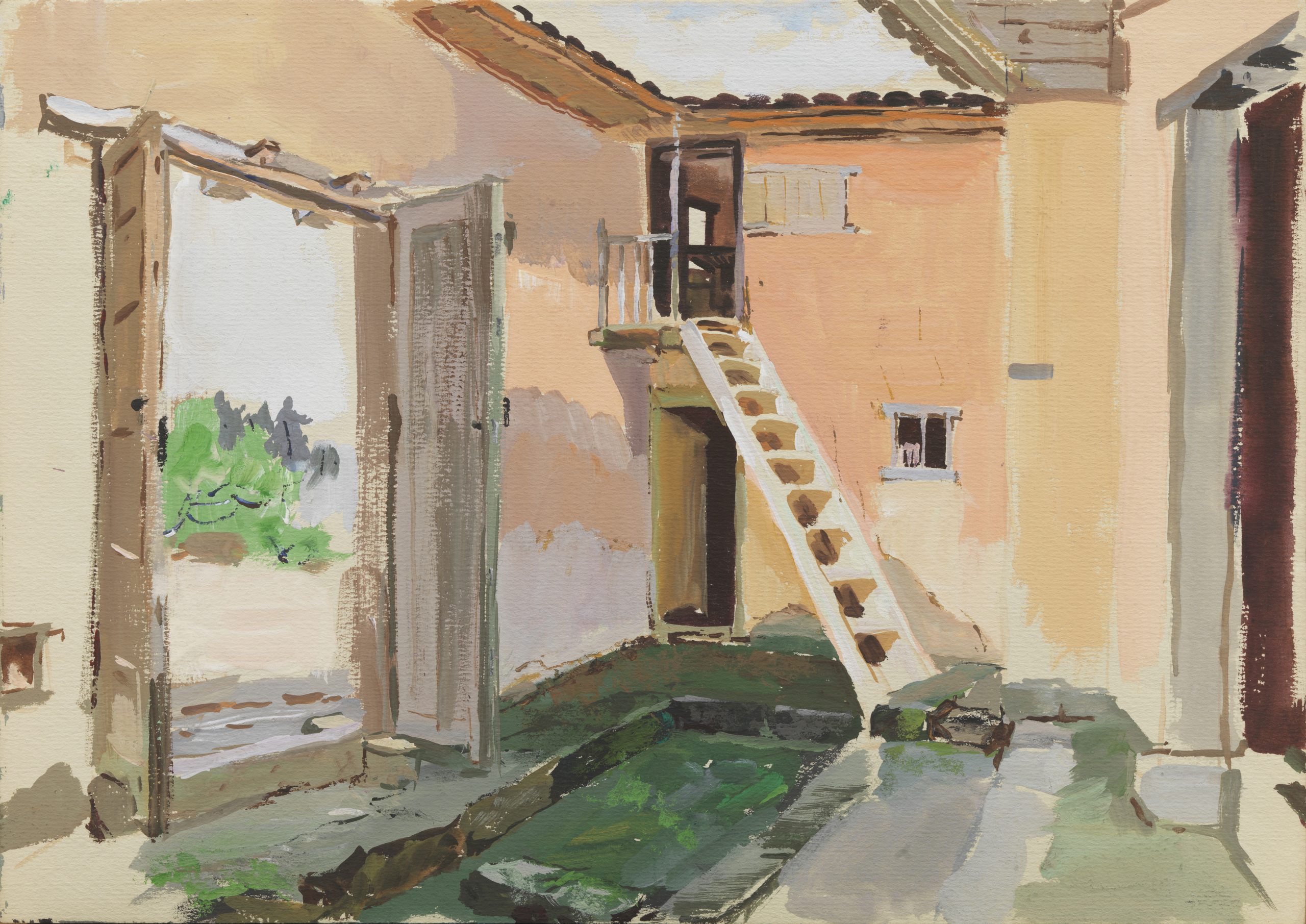 PANG TAO 厐壔 b. 1934 Chairman Mao’s Former Residence During Jinggangshan Period 井冈山时期毛主席旧居, 1977 Gouache on paper纸本水粉 27 x 38.5 cm (10 5/8 x 15 1/8 in.)